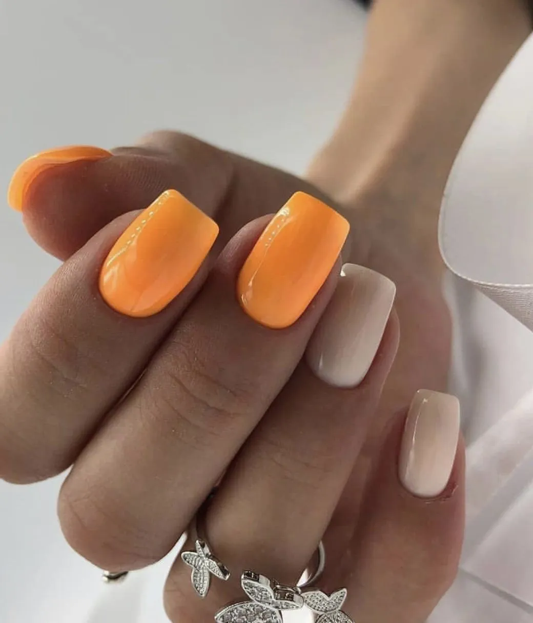 Джерело: pinterest Цей вражаючий манікюр поєднує яскравий оранжевий відтінок з ніжними нюдовими пальцями, створюючи ідеальну гармонію. Гладка текстура і глянцевий фініш підкреслюють сучасний стиль та елегантність.